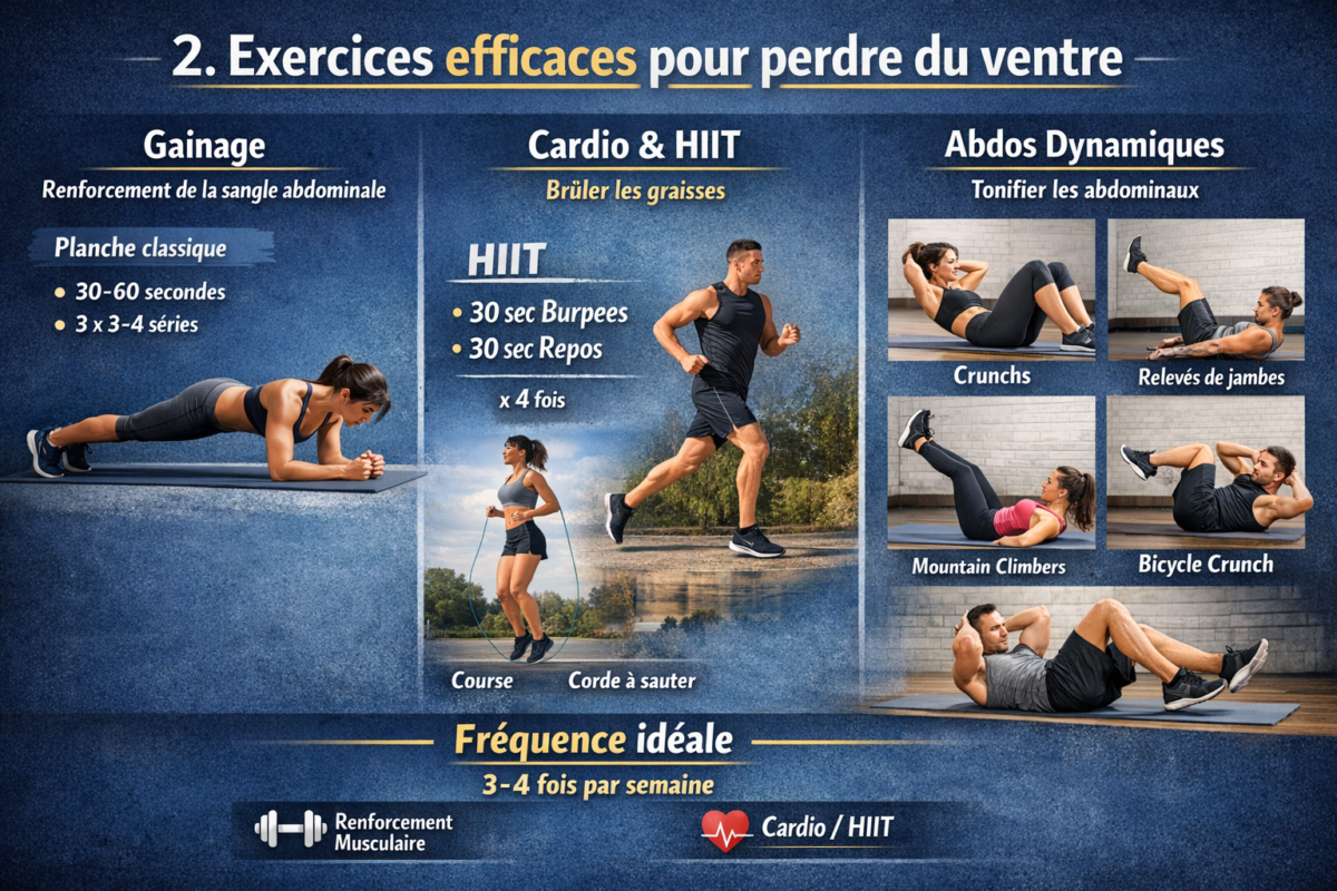 En définitive, les exercices efficaces perdre ventre reposent sur une combinaison stratégique : renforcement profond, cardio intense et régularité.